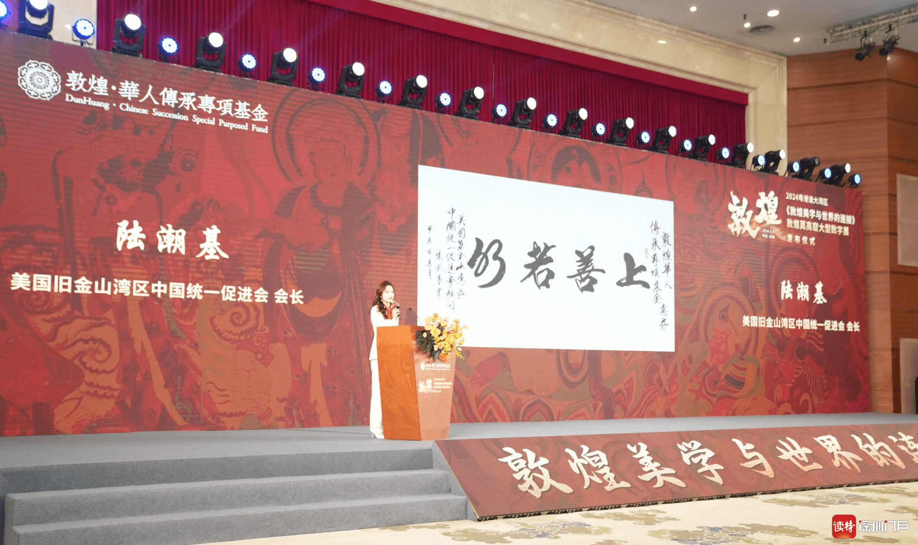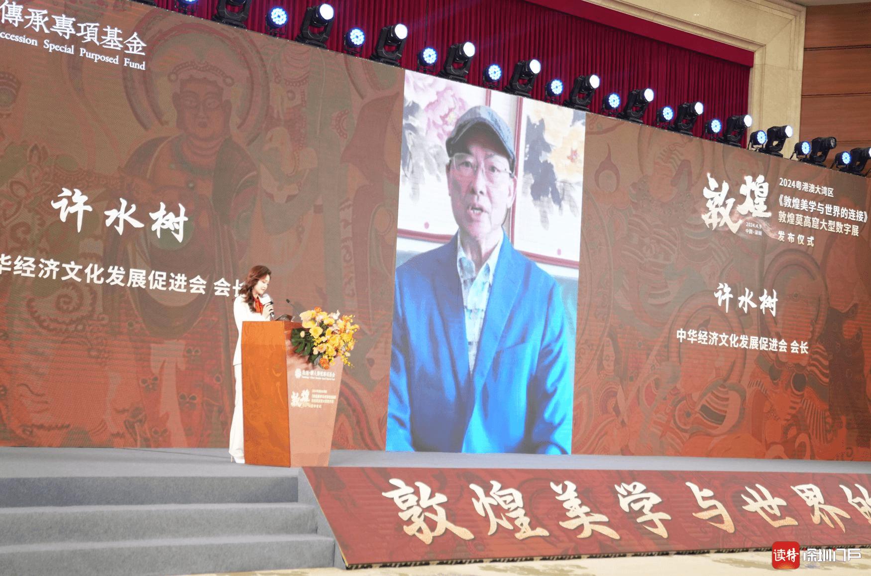 4月9日上午,2024粤港澳大湾区《敦煌美学与世界的连接》敦煌莫高窟大型数字展在深圳五洲宾馆举行发布仪式。深圳市政协原副主席吴井田,敦煌研究院院长苏伯民,深圳报业集团党组书记、社长丁时照,浙江省政协常委、浙江小百花越剧院院长王滨梅,敦煌·华人传承专项基金理事长王海等参加活动。