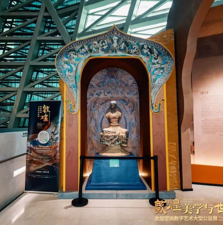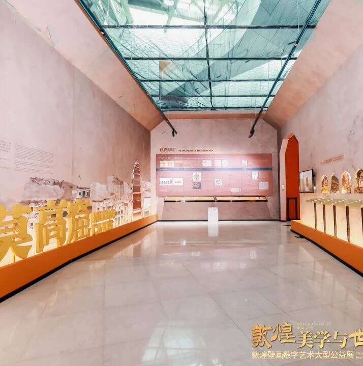 据了解,本次展览精选40余幅通过数字化技术复刻的敦煌石窟壁画、4座1:1原样数字化洞窟(428窟、285窟、第3窟、藏经洞)、5尊等比例彩塑以及藏经洞出土文献的复制品,以及敦煌石窟中有关中西文化交流互鉴的专题展墙和多媒体产品,通过这样的展程方式,让观众能够近距离、多维度、全方位地观赏敦煌文化艺术的深厚内涵,探寻敦煌美学的奥秘与魅力。本次展览将于9月24日正式对外开放,展期2个月,为了更好地将展品故事呈现给观众,本次展览还邀请来自敦煌研究院的专业讲解员提供免费讲解服务。