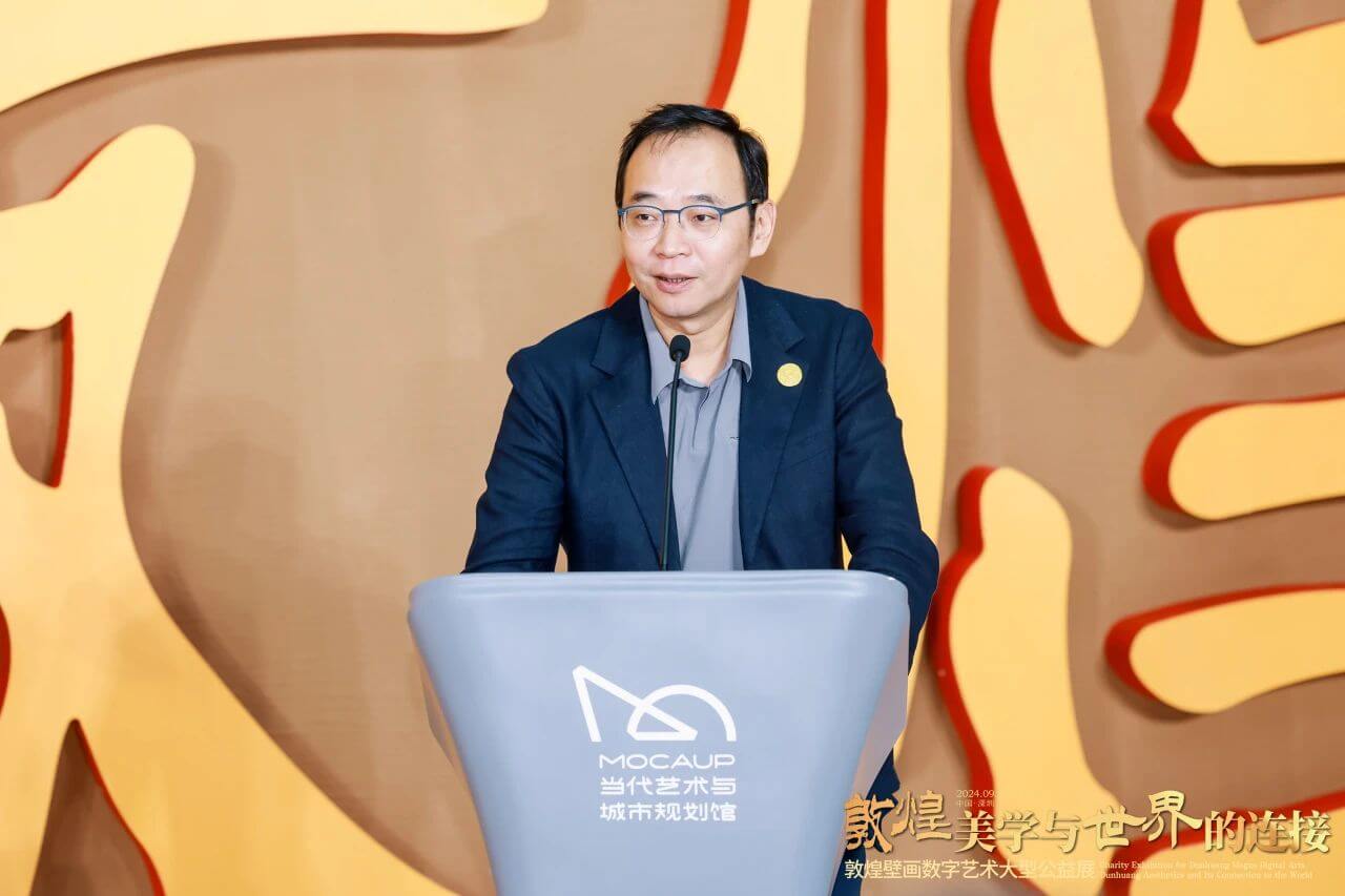 开幕式现场,深圳市当代艺术与城市规划馆馆长颜为昕致欢迎辞。他表示,本次展览将拥有2000多年历史的敦煌文明通过当代艺术的方式重新表达,这种形式能激发深圳这座城市的年轻人更多参与到文化遗产的保护和传承。