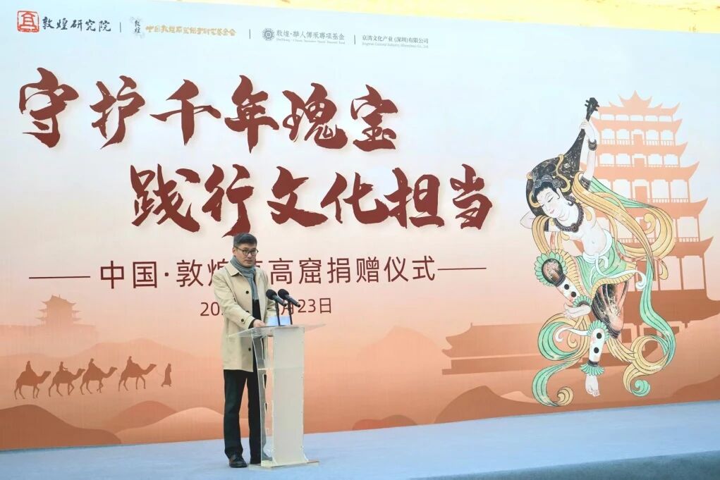 捐赠仪式上,京湾文化董事长赖润泽先生表示:“文化是民族的根脉,保护文化遗产就是守护我们共同的精神家园。敦煌艺术所蕴含的开放包容、美美与共的精神,与我们企业的核心价值观高度契合。京湾文化作为一家植根于文化产业的企业,我们深知商业价值之上更应有文化担当。此次捐赠不仅是一份心意,更是我们履行社会责任、回馈社会的具体行动。我们希望这笔资金能为敦煌石窟的保护事业添砖加瓦,让这些珍贵的文化遗产能够更好地传承给子孙后代。”